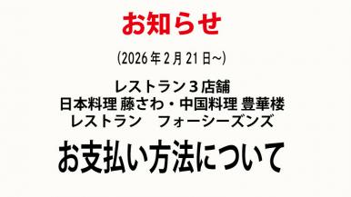 館内レストラン3店舗 日本料理 藤さわ・中国料理 豊華楼・レストラン フォーシーズンズは 2/21より不具合により、電子決済及びQR決済ができなくなっております。 皆さまには大変ご迷惑をおかけして申し訳ありませんが 復旧まで、お支払いはクレジットまたは現金とさせていただきます。