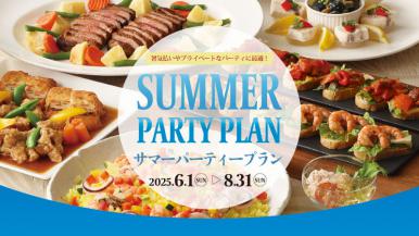涼しい会場で楽しむ『サマーパーティープラン』 大小22の会場よりお客様の人数に合わせて最適な会場をご提案いたします。 ホテルならではの優雅な会場で楽しいひとときをお過ごしください。 ◆ご利用期間 2025年6月1日(日)~8月31日(日)迄 ◆《ビュッフェ(洋中折衷)》フリードリンク2時間付 20名様~ お一人様 7,500円(税込) メランジェサラダ スモークサーモンのコンディメント添え コールミートとチーズ盛り合わせ 蒸し鶏と胡瓜の棒棒鶏風 マカロニとミートソースのチーズグラタン 白身魚のレモンペッパー焼き 夏野菜添え チキンのハーブスパイス焼き ローストポーク ハニーマスタードソース 冷やし蕎麦 イカのチリソース 肉団子の甘酢炒め 焼売 炒飯 フルーツ入り杏仁豆腐 プティケーキ盛り合わせ コーヒー ◆《卓盛(和洋中折衷)》フリードリンク2時間 15名様~ お一人様 8,500円(税込) スパイシーシュリンプとカポナータ バゲット添え 蒸し鶏の柑橘和風ジュレ掛け 加治木(カジキ)鮪と夏野菜バジルオイル掛け 鶏治部煮と揚げ豆腐 イカのチリソース ビーフステーキ シャリアピンソース (ステーキは加工肉を使用) シーフードピラフ ケーキ盛り合わせ コーヒー 【フリードリンクメニュー】 瓶ビール ノンアルコールビール 焼酎(芋・麦) ウィスキー ワイン(赤・白) 梅酒 カクテル レモンサワー ノンアルコールカクテル 烏龍茶 オレンジ アップル グレープフルーツ コーラ ジンジャーエール ◆特典 宴会場・音響使用料2時間サービス 事前予約にて送迎バスサービス ◆オプション デザートビュッフェ お一人様 1,300円 ◆注意事項 料金には消費税・サービス料が含まれています ビュッフェの料理は出し切りとなります。 ご予算に応じてグレードアップも承ります メニュー内容は変更する場合がございます 人数(食数)の変更は前日12時迄とさせて頂きます