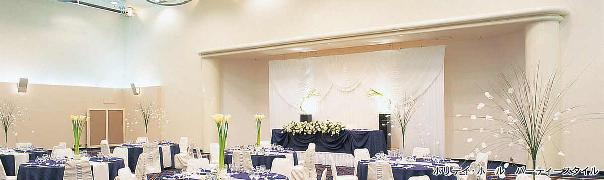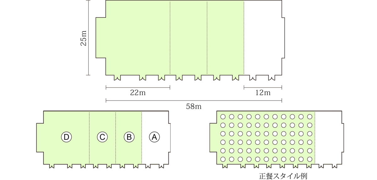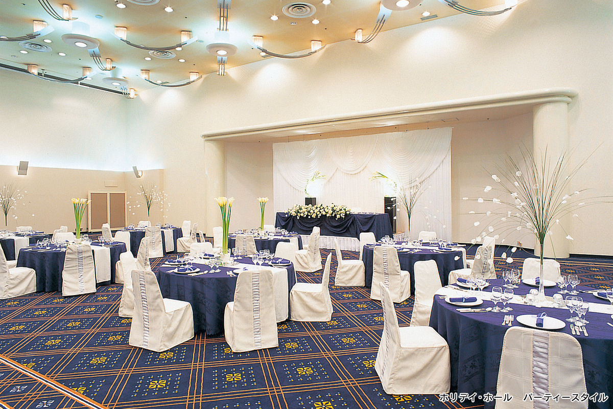 ホリデイ・ホール(D) 面積:568㎡(172坪) 高さ:7.0m| 名称 | 面積(㎡) | 面積(坪) | 天井高(m) | 収容人数 (宴会・着席)(人) |