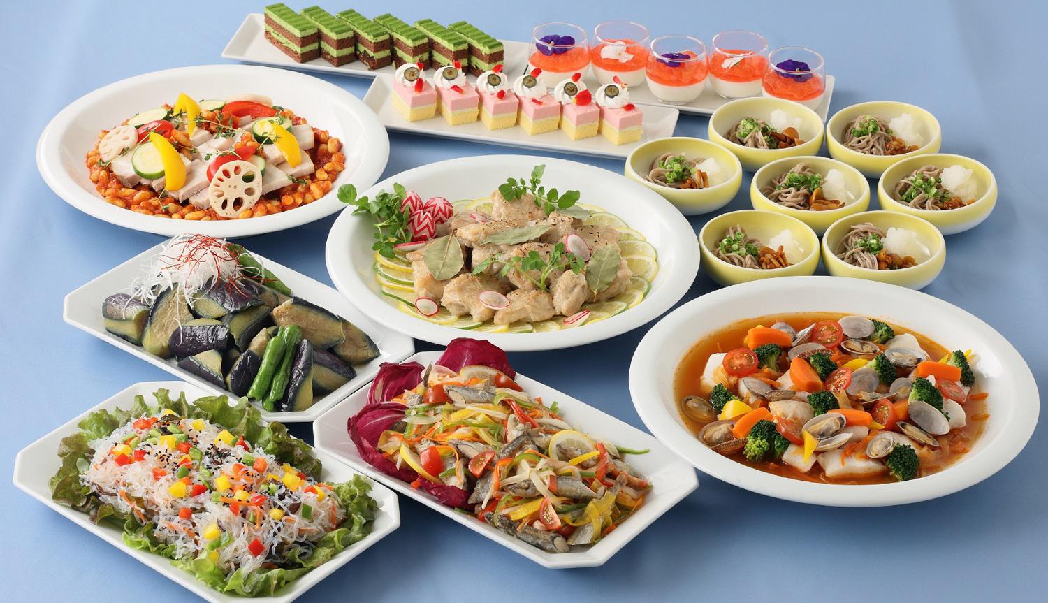 イタリアンに和のテイストもとりいれたビュッフェ 嬉しいソフトドリンクバー付 色とりどりのスイーツも人気です 平日は『フィレンツェ風豚ロースの低温調理』、 土日祝は『特製ローストビーフ』をシェフコーナーにご用意!