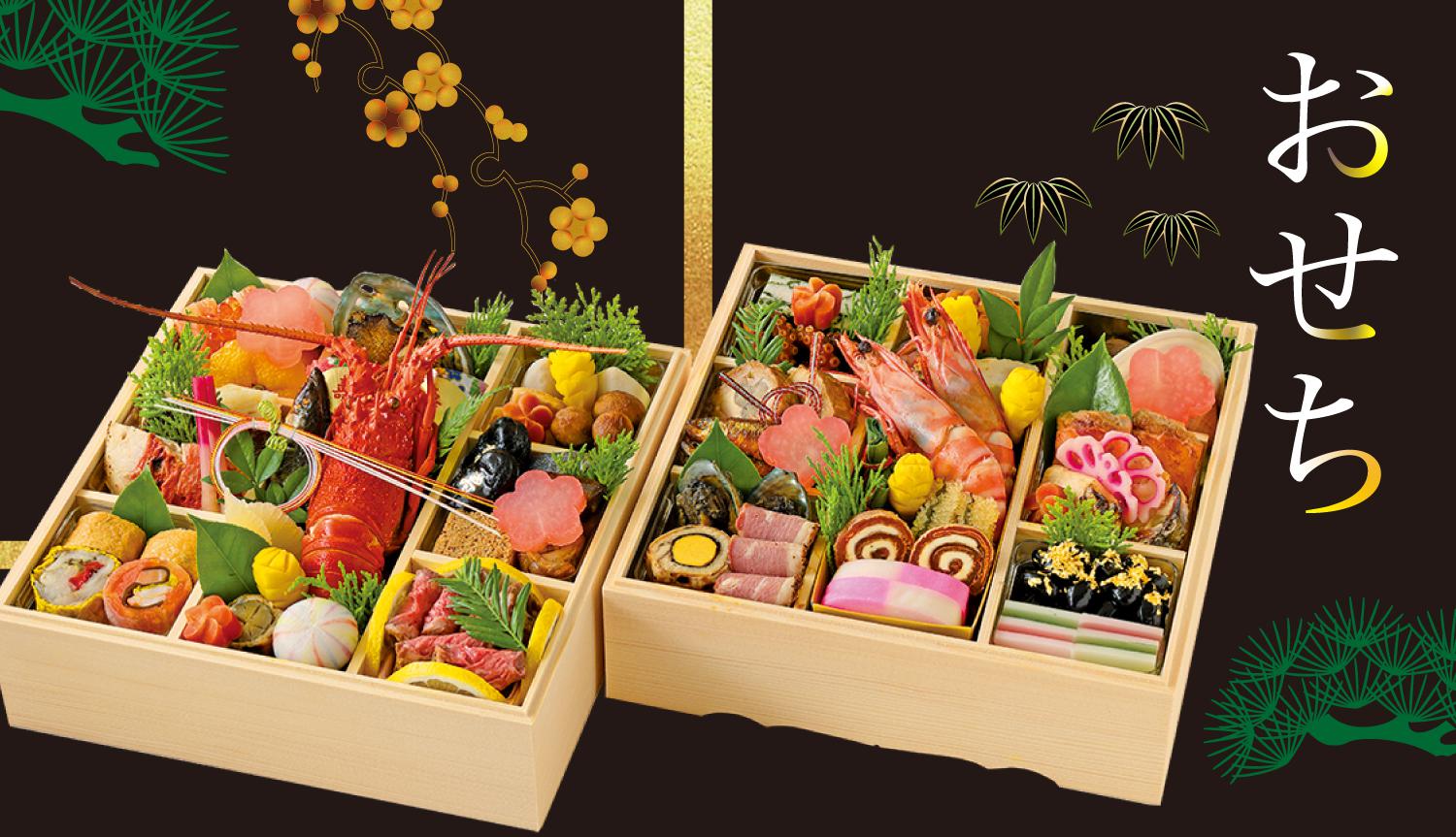 海老芋白煮、松茸煮、筍煮、梅京人参煮、松笠姫慈姑煮、蝦夷鮑黄金焼き、数の子、鰻八幡巻、友禅包み、鶏松風、焼き帆立、手毬餅、太刀魚八幡巻き、鰤照り煮、蕎麦寿司揚げ巻き、鮗菊花巻、ともえ金時巻、ずわい蟹、なます、いくら、栗甘露煮、寿お多福豆、柚子柚餅子、