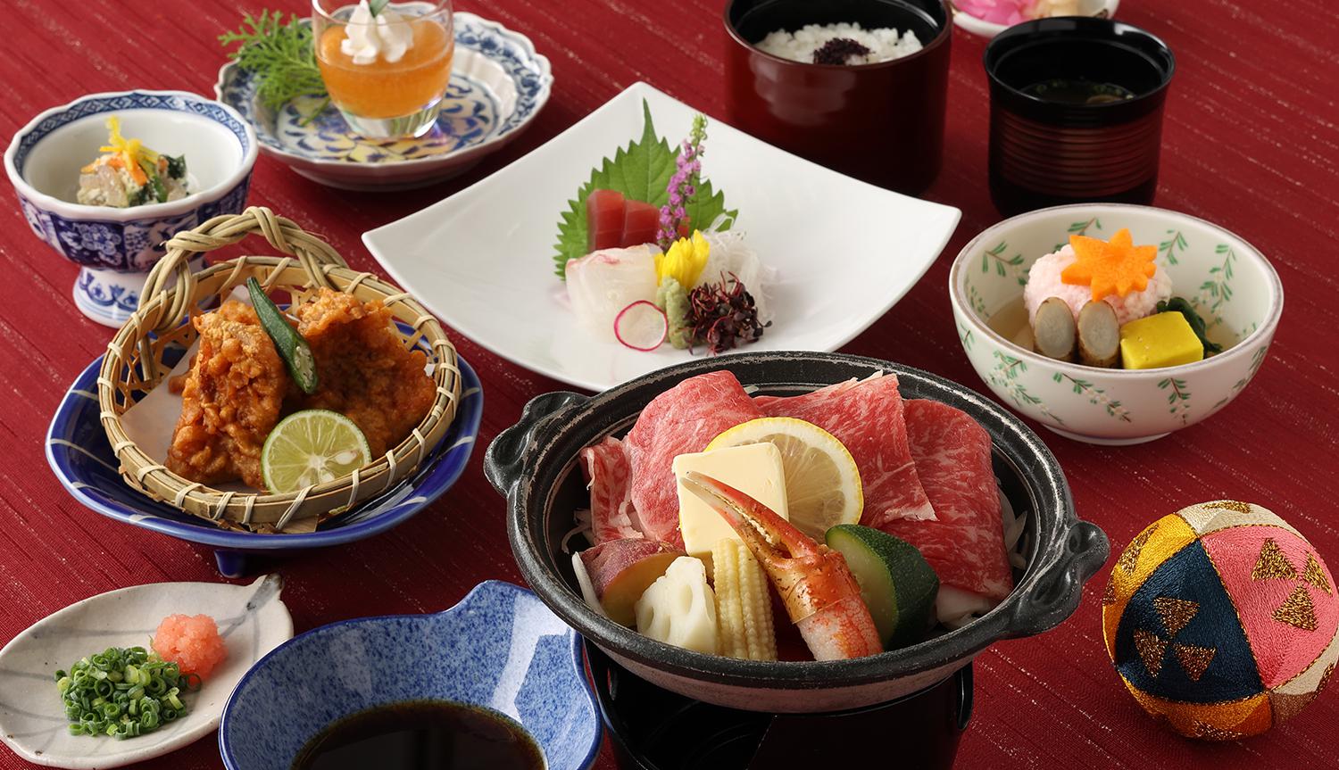 国産牛を陶板で焼いてお愉しみいただけます 揚物やお造りも付きボリューム満点 寒い季節ならではの御膳です