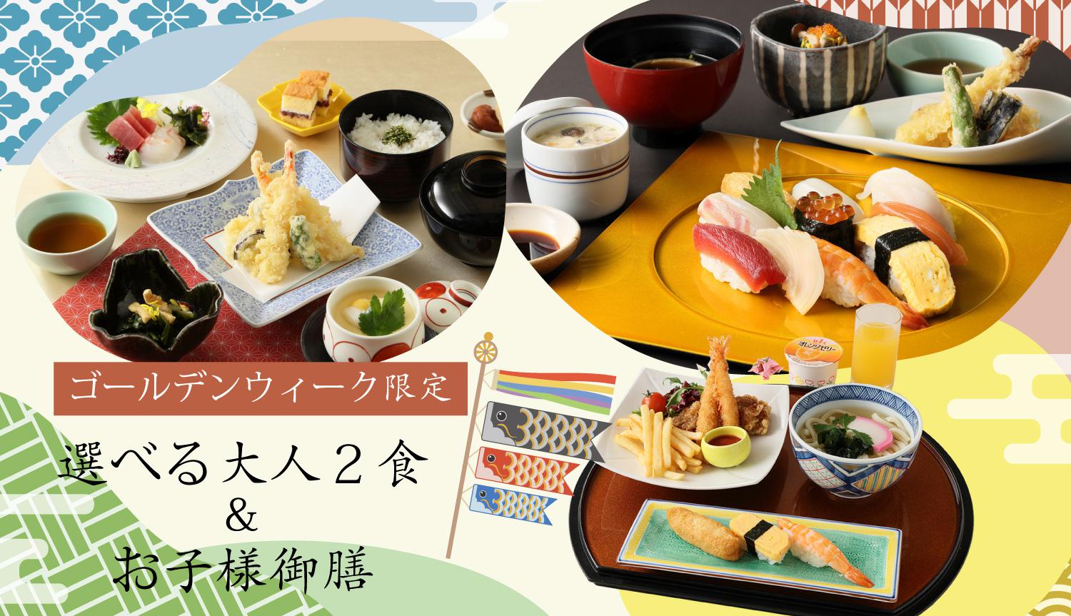 GW(4/29~5/6)ランチご利用の方、オンライン予約限定で 大人2食分(通常¥4,400)+お子様御膳セット(通常¥1,200) 合計¥5,600のところ¥5,000でご提供 大人の方2食は↓からお選びいただけます 『寿司昼膳(通常¥2,200)』または『天婦羅御造り御膳(通常¥2,200)』